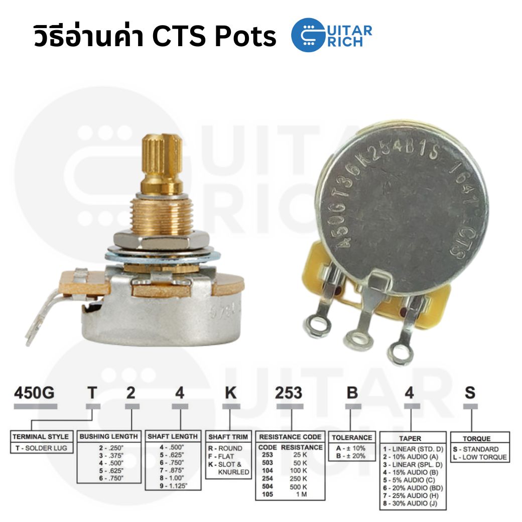 1. รหัส 4 ตัวเเรก เช่น 450G คือ รุ่นหรือซีรี่ห์ของ POT บางรุ่นอาจขึ้นต้นด้วย EP ซึ่งเป็นรหัสของลูกค้าที่ CTS ผลิตให้ เช่น Allparts, Gibson